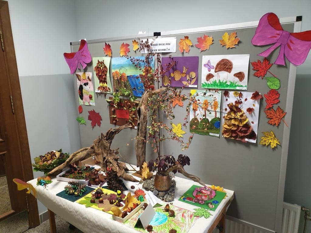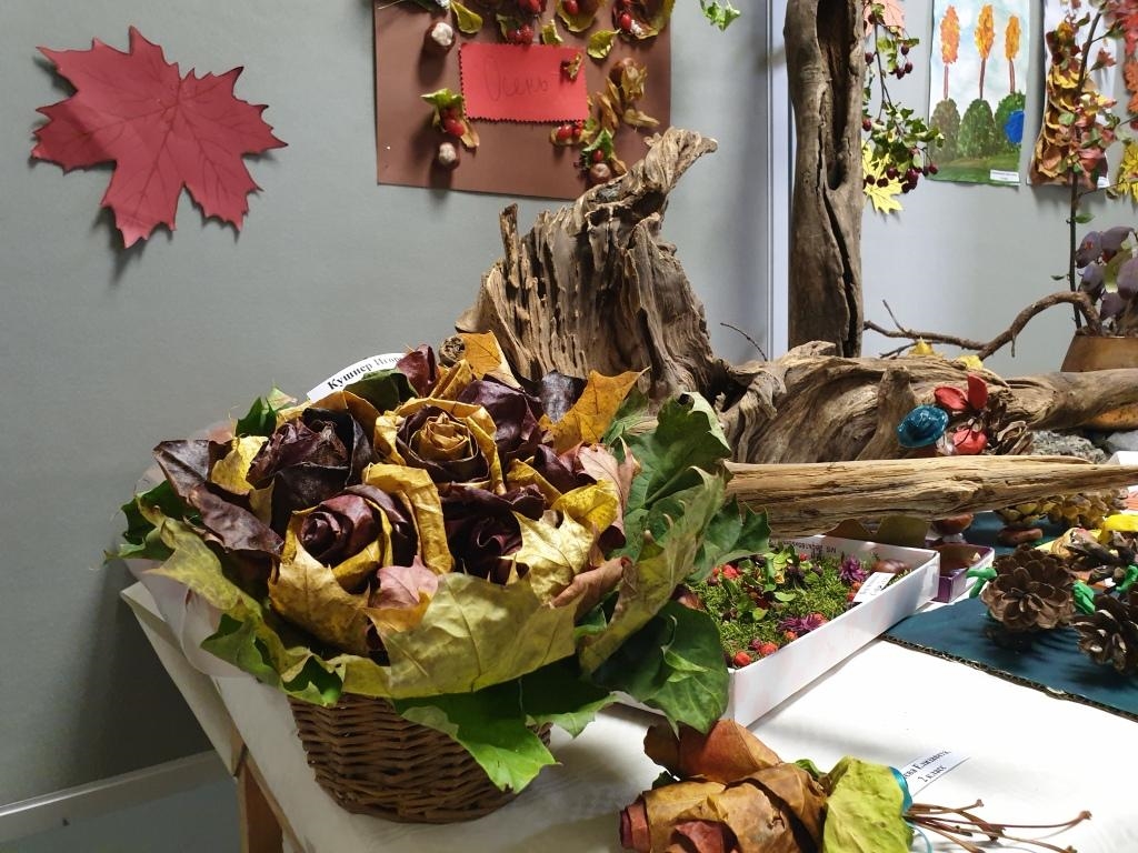 В холле школы расположилась выставка рисунков и поделок из природного материала «Краски осени».